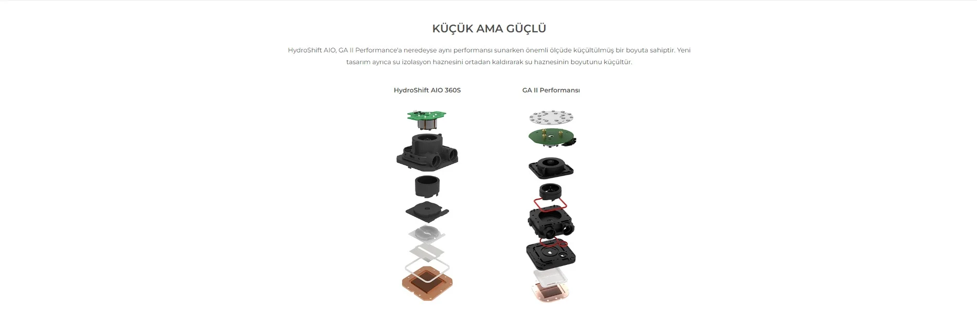 HydroShift AIO, GA II Performance'a neredeyse aynı performansı sunarken önemli ölçüde küçültülmüş bir boyuta sahiptir. Yeni tasarım ayrıca su izolasyon haznesini ortadan kaldırarak su haznesinin boyutunu küçültür.