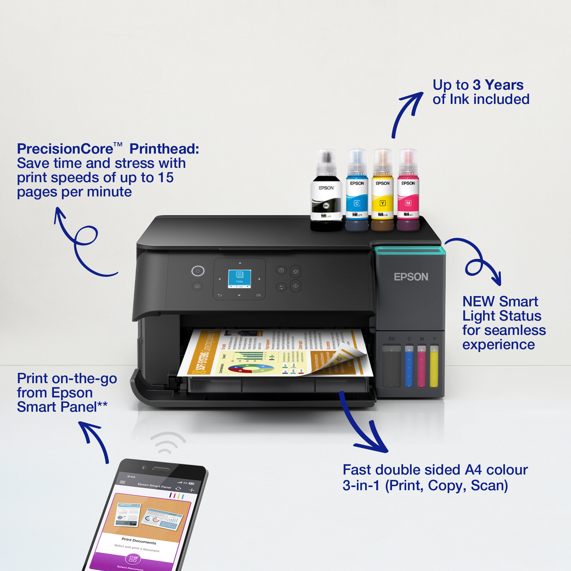 Hiçbir kartuş içermediğinden değişim de gerektirmeyen, Wi-Fi Direct ve LCD ekrana sahip bu yazıcı, sayfa başına inanılmaz düşük maliyetle yüksek kaliteli baskılar almak isteyen herkes için mükemmel bir çok fonksiyonlu (yazdırma-tarama-fotokopi) çift taraflı yazıcıdır. Yüksek kaliteli belge baskı deneyimi için Precision Core Technology ve pigmentli siyah mürekkeple solmayan mürekkep özelliği sunar. Gelişmiş deneyim için Smartlight Durum
